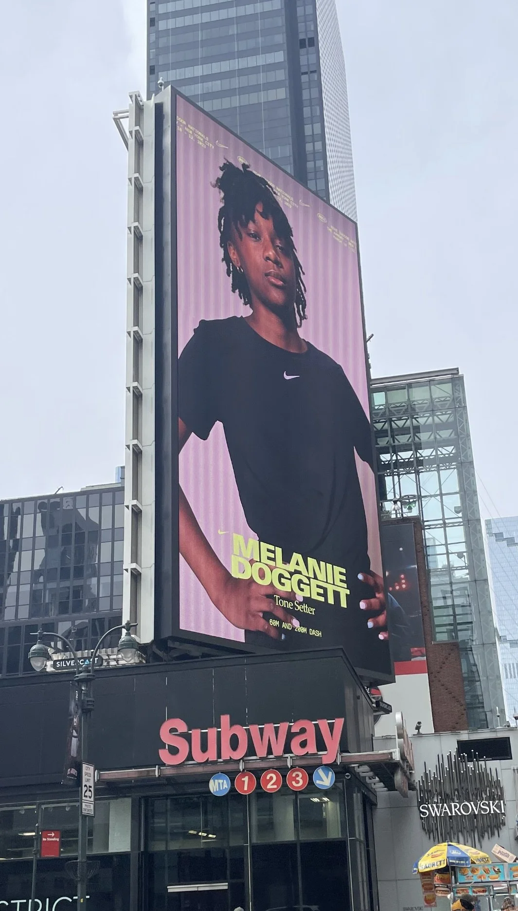Melanie Doggett featured on Nike’s billboard during the weekend of the Nike Indoor Nationals meet in New York, NY. March, 2023.